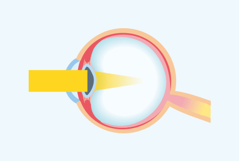 水晶体が濁ることで、光が入りづらくなり見え方が低下します。眼によって濁り方や濁りが発生する場所が異なり、中心部から濁り始めると早い段階で見え方が低下します。ほとんどの場合ゆるやかに進行していき、徐々に見え方が低下していきます。病気が進行するとやがて失明に至ります。医療水準が高い日本においては白内障による失明はまれですが、世界では失明理由の第一位が白内障です。