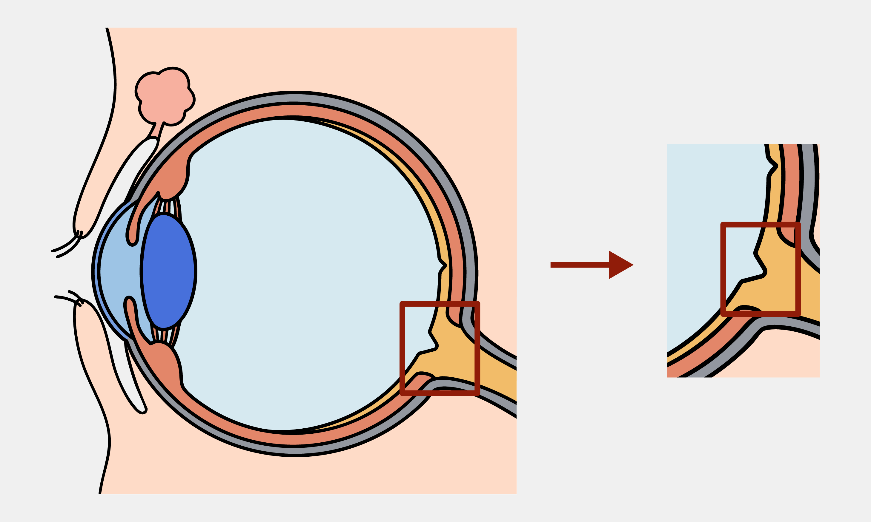 緑内障の最大の原因は眼圧です。眼圧が高くなることで視神経が障害され、視野が欠損していきます。眼圧は房水の産生と排出のバランスに左右され、産生が増えるか排出が減ると眼球内の房水の量が増え眼圧が上昇します。房水は角膜や水晶体といった血管が無い組織に栄養を与える役割を持った液体です。毛様体という組織から分泌され、線維柱帯というフィルター状の組織を通ってシュレム管へと流れていきます。